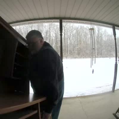A man tries to carry a heavy cooler up a flight of porch stairs, but he loses his balance and falls off the steps. A man comes out of the house and asks"Where'd he go?" Security footage.