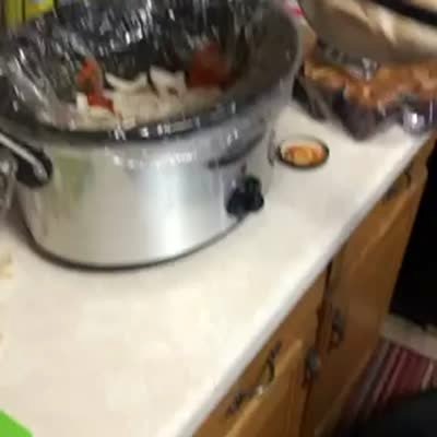 A young boy holds a pan of mushrooms over a crockpot in the kitchen. The woman with the camera asks him where he is about to put the mushrooms and he says "crotch pot."