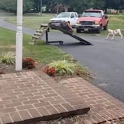 A man yells while he trips and falls next to a ladder in a yard, then a woman comes out of a trailer and asks him where he is, but she looks in the wrong direction. Security footage.