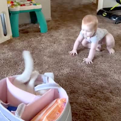 A baby crawls towards a basket where a cat sits and reaches for the cat. The cat catapults into the camera and runs out of the room.