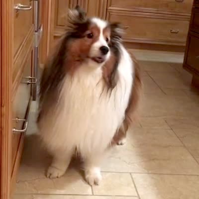 A dog repeatedly taps with its paw a cabinet where the treats are kept, trying to get a man to give him a treat.