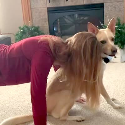A woman films a dog jump up at the kitchen counter. She walks over and sees that the dog is after a bottle of wine with a Santa topper. She laughs. Suddenly, the dog jumps up, grabs it and flings it to the floor where it shatters. The woman screams.