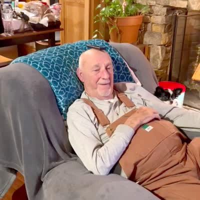A man places a remote control on a man's head after he wakes up from a nap in a recliner. He then asks the man where it is as the man pats around the chair to find it.