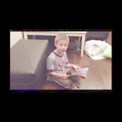 A boy is reading a book on the floor at home while his father films him. A girl in a wolf costume jumps out of a trunk behind him and he jumps up, screaming, and runs away. Practical joke. Scare.