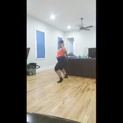 A woman dances on a wooden floor and slips and falls.