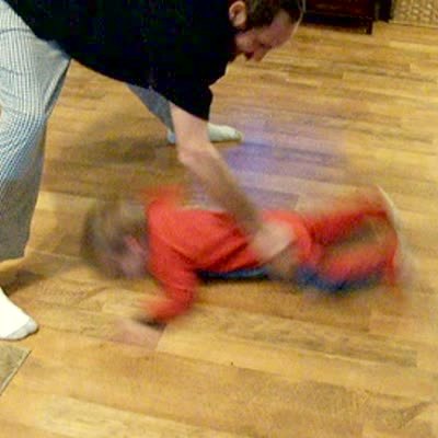 A senior man and a boy sit on the kitchen floor and the man pours some water on the floor between them. He tells his grandson that he can wipe up the water before the boy would have a chance to hit his hands with a wooden spoon. When the man says "go," he pranks the boy and grabs him by his legs and slides him over the water and wipes it up.