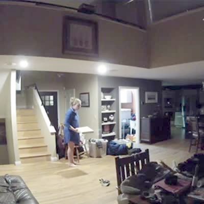 A family acts out clues while playing the game "Heads Up." The word "backflip" comes up, and a teen boy does a backflip but breaks a ceiling light.