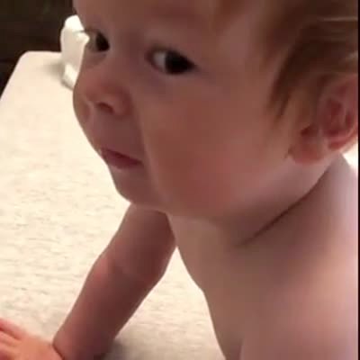 A baby boy lays on a bed in a bedroom and says "hey google" for his first words.