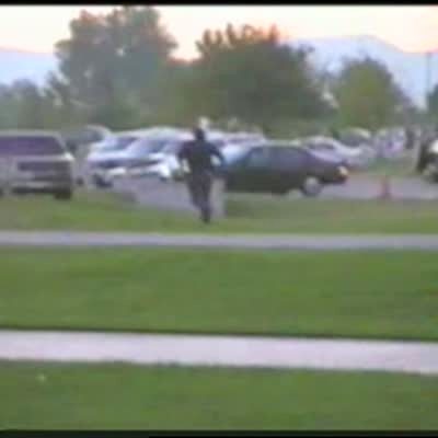 Man runs toward a parking officer about to write him a ticket & man falls in the grass. He gets up & moves his car before getting the ticket. .