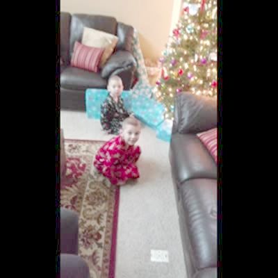 Tot girl is in front of the Christmas tree while mom sings "Jingle Bells." She stops singing to poop in her diaper. Mom asks if she's going right now & girl says "yes."